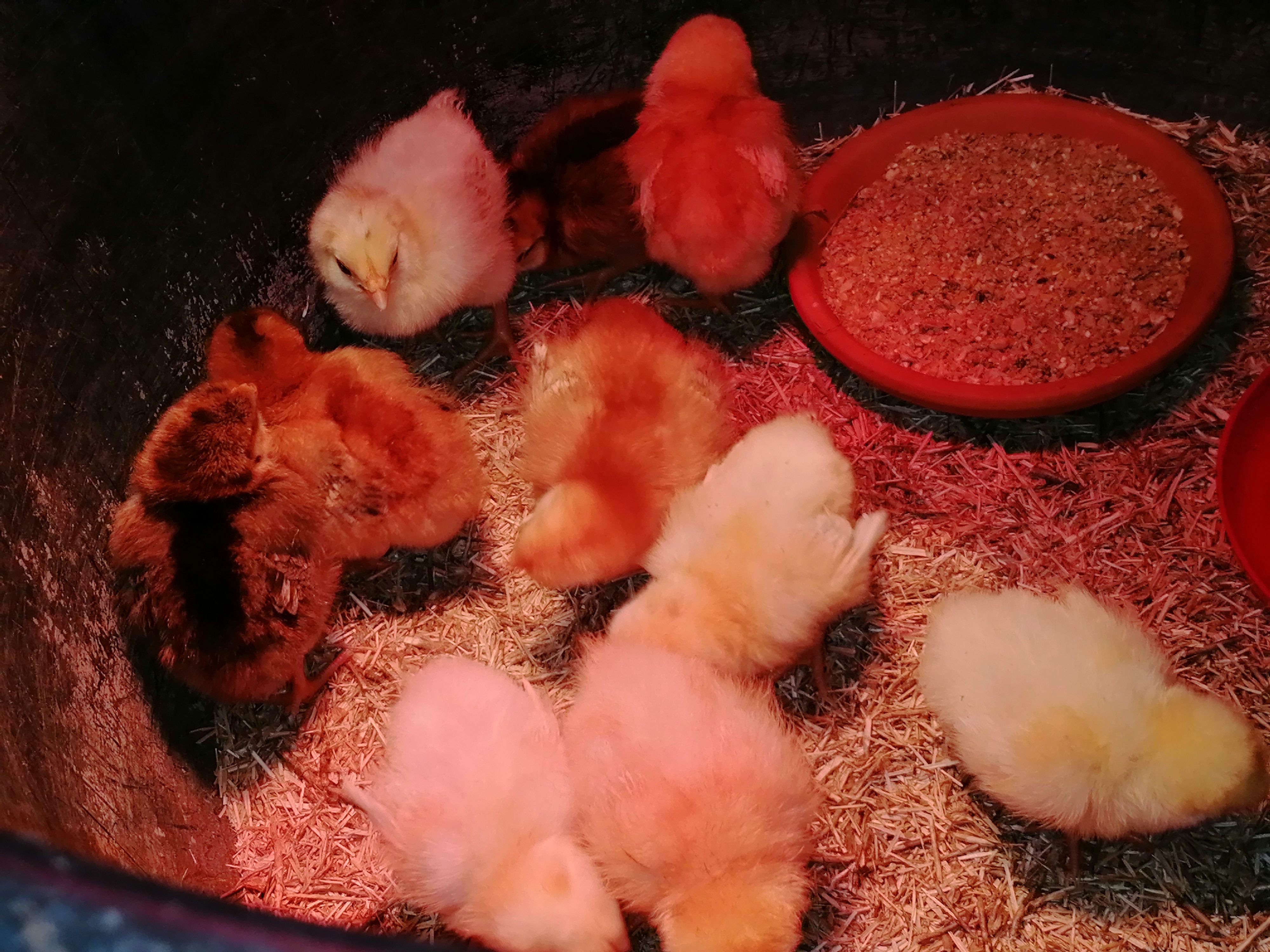 Deze week zijn de kuikentjes uit de eieren in de broedmachine gekomen. We hebben nu 10 kuikentjes in allerlei kleuren. Ze zitten nu nog lekker onder de warmte lamp. Ze eten en drinken volop. Er zijn nu al kleine vleugeltjes te zien.